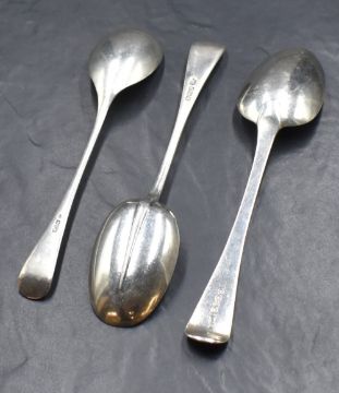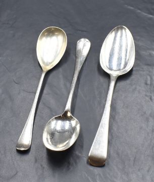 A George IV silver Old English pattern serving spoon, marks for London 1824, maker Thomas Dicks, along with a Hanoverian rat-tail pattern serving spoon and a further Hanoverian pattern spoon, marks for Sheffield, Chester 1912 1913, makers Barker Brothers, John Round & Son Ltd, 219g gross
