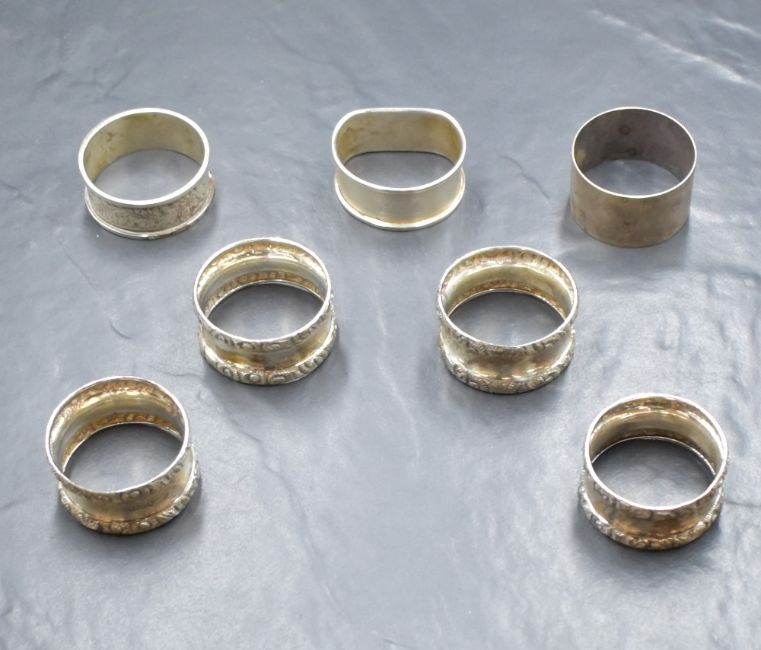 A group of four silver napkin rings, having decorative floral borders, marks for Birmingham 1902, maker Crisford & Norris Ltd, along with three other silver napkin rings, 86g gross