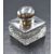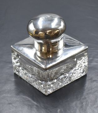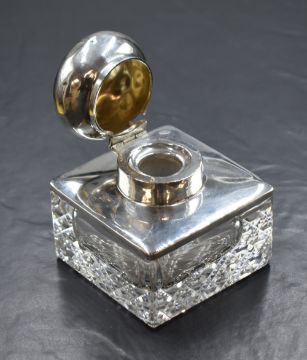 A George V silver mounted cut glass inkwell, of square form having a circular cap engraved 'B.P.', marks for Birmingham 1913, maker Henry Clifford Davis, 9cm x 11cm H. Dents to the cap which does not close properly