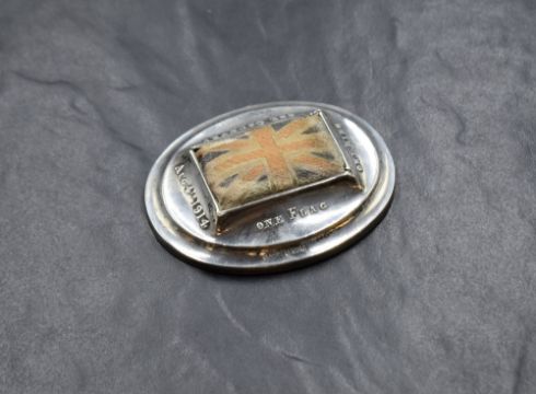 An early George V silver novelty pin cushion, having a central Union Jack flag cushion with 'One Flag, One King, One Country Aug 4th 1914' to the exterior, marks for Birmingham 1914, maker R U & Co, 38g