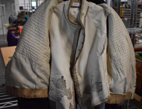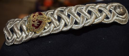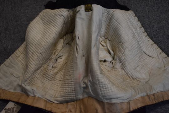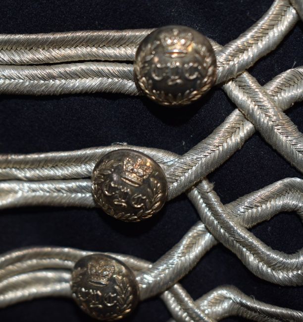 Victorian period Cavalry/Yeomanry type Dress Uniform Jackets with intricate and elaborate ropework designs, one with intricate white silver embroidered waistcoat, both black and manufactured by Jones & Co of London and having rank epaulettes, one with Major's Crown and full-length silver-bauble fastenings, having six decorative Regimental buttons, the other with Captain's pips and full-length silver Regimental button fastenings in a group of twenty-two and two groups of nineteen buttons. The Regimental buttons have a Victorian Crown above the letters C Y C in English script and surrounded by laurel leaves, with makers mark on the rear. Moth damage, worn and dirty condition, reasonable for age.(3)