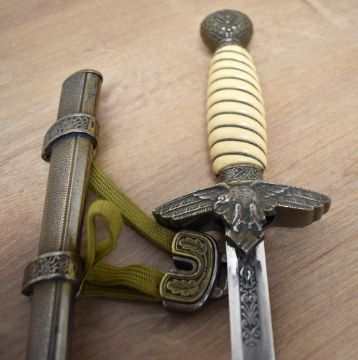 German 3rd Reich Luftwaffe-style dagger with hangers, embossed floral design to blade near hilt, no makers mark seen to blade, hangers and/or scabbard. Ideal for display and/or re-enactment.(1) Buyers must be aged 18 or over and show proof of identity.