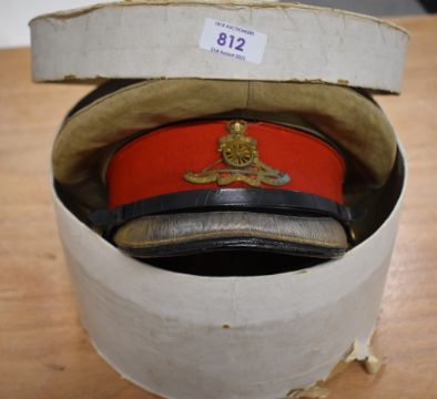 WW1 period Royal Artillery Officer's hat in original A.J. White of London box named to COLONEL E.C. SANDERS, 4 South Bolton Gardens, So Kensington, the hat in light khaki with red band, black peak with silver wire braided edge, King's Crown RA badge, leather chinstrap with RA buttons, leather internal and stamped inside HAWKES & Co No.14 PICCADILLY, no sizes seen.(1) PLEASE NOTE: online sources confirm a 'Colonel Edward Carew SANDARS CMG' as serving with the Royal Artillery during the Boer War and being recalled for service in WW1 as Assistant Director to Remounts, Royal Artillery, being the father of the eminent archaeologist Nancy Sandars - whether or not this hat belonged to THAT 'Colonel Sandars' requires further investigation.