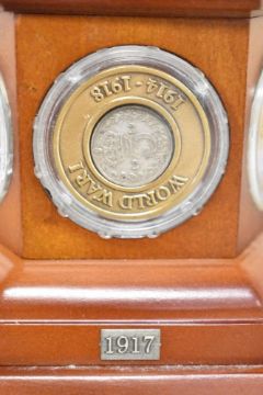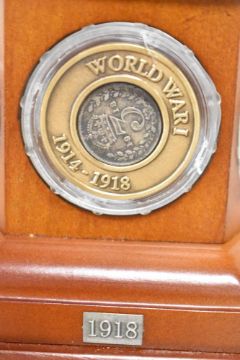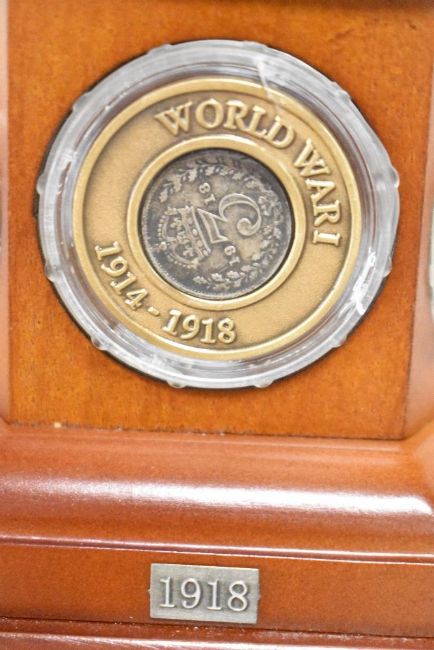 Danbury Mint bronzed sculpture For The Fallen, 'a tribute to the brave British serviceman' depicting a British soldier with head bowed and upturned rifle, set on a six-sided wooden plinth with a specially-commissioned commemorative coin and five genuine dated silver threepences representing each year of the Great War, from 1914 to 1918, in circulated condition, all in plastic holders and fitted into the wooden plinth, unboxed, 12cm x 12cm x 33cm high overall, the soldier 22cm. Sold with Certificate of Authenticity.(1)