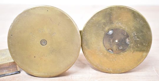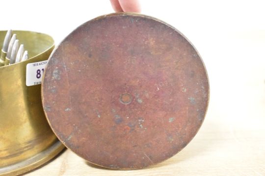 WW1 Trench Art brass shell case bases and items, two British bases dated 1917 and 1918, a clip of .303 and other loose shell casings, two smaller German shell bases in form of candle holders, one with handle stamped Berndorf 1913 and the other Dusseldorf 1917, a decorative brass matchbox clip etched Lille 1919, a brass conical cigarette holder and ashtray with embossed RA and card bottom and a flip-lid ashtray in form of a British Officers cap, with Regimental badge and Major's rank pip, smallest 6.5cm diameter 5cm height, largest 12cm diameter x 9cm height.(8)