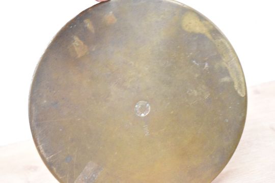 WW1 Trench Art brass Turkish 75mm QF 18-pounder inert/deactivated shrapnel shell, probably supplied by German government for use at Gallipoli, case stamped QF 18PR VIII F.S. B.S.C. 11/15 and numbered 02 underneath, complete with brass incremental fuse cap, metal tip stamped 9/15 V.S.M 80.IVA 721U with copper drive band below raised, decorated band, 8cm diameter x 30cm height. Sold together with WWI brass German shell base stamped MAI 1914 GFSP GFSP4 with recessed central disc stamped with makers mark, 23.5cm diameter x 5cm height and well-rusted fuse cap, obviously as found on the field of battle.(3)