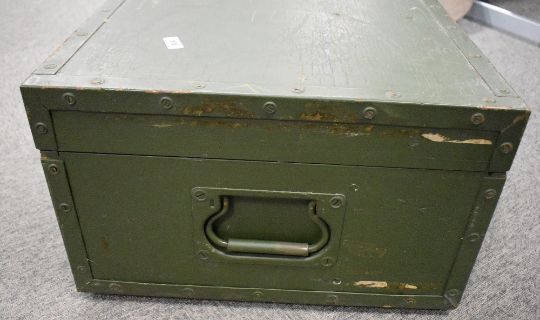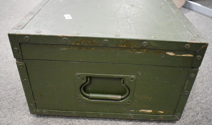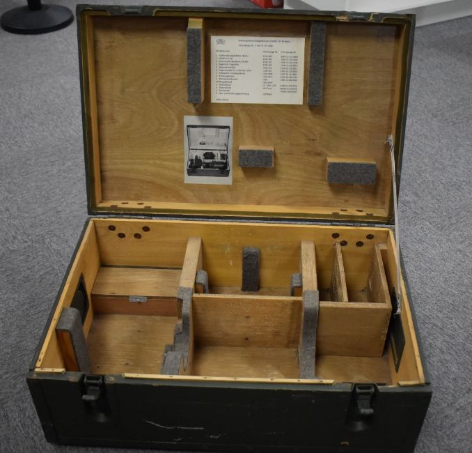 Post-war vintage German Army trunk, fitted for a Carl Zeiss Richtungsweiser-Doppelfernrohr RWDF 10x50 periscope, no dates seen but probably NATO period or earlier. Dark green wooden box, metal edging straps, hinges and handles, wooden compartments with contents list and photograph for identification, 47cm x 73cm x 29cm high.(1) In good, useable condition.