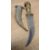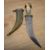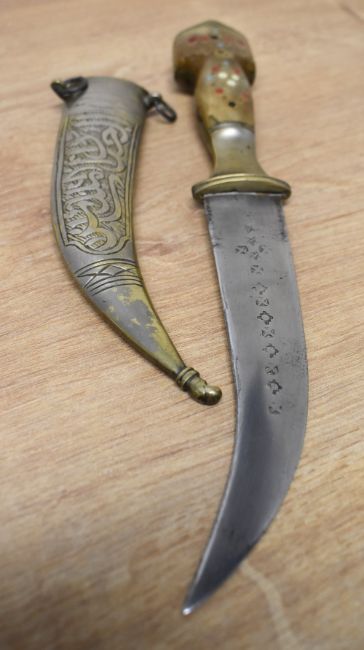 Jambiya-style dagger/knife of Middle Eastern or possibly North African origin, 16cm steel blade curved towards end and etched centrally on one side with stars, crosses and symbols, with polished handle decorated on one side with coloured circles, in finely etched decorated metal scabbard with two metal rings, 30cm overall. A nice, original piece. Sold together with a Sikh Ceremonial Kirpan dagger/knife, 20cm steel blade curved towards end with wear and pitting, wooden handle in etched cross-hatched decorated brass scabbard, 39cm overall.(2) Buyer must be over 18, proof of identity required.