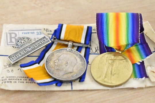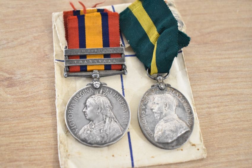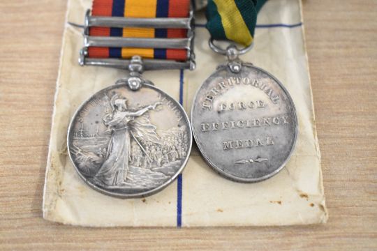 Thistlethwaite Family medals, Queen's South Africa Medal with clasps Transvaal and South Africa 1902 correctly impressed 7563 PTE J. THISTLEWAITE. (note spelling) BORDER REGT with several edge knocks not affecting naming, British War and Victory Medals both correctly impressed 815 A.W.O.CL. 2. J. THISTLETHWAITE. R. LANC. R. and GV Territorial Force Efficiency Medal correctly impressed 815 SJT: J. THISTLETHWAITE. 4/R. LANC: REGT group of four with Imperial Service badge and two OHMS registered envelopes addressed to Mrs E. J. Thistlethwaite in Hawkshead, Lancashire. Online sources confirm award of QSA and two clasps for service with 1st Battalion Border Regiment and the WW1 award of 1914-15 Star (not present), BWM and VM, on original ribbons, for service with Royal Lancaster Regiment, specifically 1/4th Battalion and with whom 200019 SGT JAMES THISTLETHWAITE was KILLED IN ACTION on or since 20 September 1917 (death presumed 29 September) at Passchendaele. Born 1879 in Wray, Lancashire, he entered France 3 May 1915 and is buried in Tyne Cot British Cemetery. Sold together with his son's medal group of four for service in WW2, comprising 1939-1945, Africa, France and Germany Stars, War Medal in box of issue named to Mr R.W. Thistlethwaite at an address in Hawkshead, Westmorland with Army Council compliments slip. Born in 1905 in Hawkshead, T/249574 Pte Robert William Thistlethwaite was discharged in October 1948 from 138 Petrol Depot, Royal Army Service Corps and died in 1999. A letter with the medals dated 15th June 1962 from Headquarters, 22 Group, R.O.C. addressed to Obs. R.W. Thistlethwaite and containing a ribbon, infers that the recipient was also awarded the Royal Observer Corps Long Service Medal (not present), also a hallmarked silver small medallion inscribed TARN HOWS WATCHER R.Thistlethwaite and a hallmarked silver Masonic Medal for the Hawkshead Lodge with clasp dated 1961-62, ornately engraved TO WOR: BRO: ROBERT WILLIAM THISTLETHWAITE AS A TOKEN OF ESTEEM FROM THE BRETHREN OF HAWKSHEAD LODGE in its Toye, Kenning & Spencer Ltd wallet.(11)