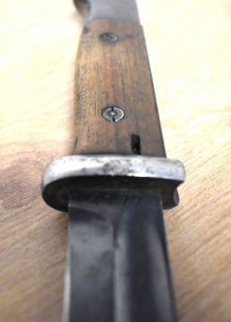 WW2 German K-98 Mauser bayonet, single edged fuller field-sharpened 25cm blade, ricasso stamped 4177 above symbol to one side and makers' mark S/155G to the other, steel crossguard and 'bird's beak' pommel stamped with two symbols above WaA253, button release catch currently seized, two-screw wooden handle, metal scabbard stamped 4177, with teardrop shaped frog stud attachment and with leather frog in good condition, overall 42cm and a nice piece.(1) Please Note: buyer must be aged over 18 and provide proof of identity.