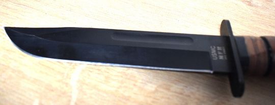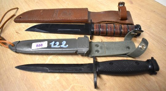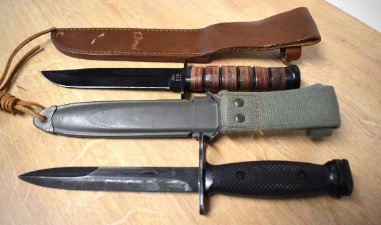 Colt M7 US Army Vietnam-period bayonet fighting knife made for the M16 assault rifle. Issued by the United States military, the M7 was also made in Canada, West Germany, Australia, and in several countries in Asia. Black and in good condition, retaining much of its original paint, the 17cm blade has the 'Rampant Mustang' logo and is marked 'COLT'S 62316 Hartford, Conn U.S.A'. The M8A1 dark green metal scabbard, having number 122 painted in white over 31 in blue, with webbing frog and attached leather string leg-cord looped through the point hole, is in equally good condition, overall 32cm. Sold together with a Bowie-style knife, 16cm black blade annotated USMC MFH INT.COMP. brown ribbed plastic handle in leather scabbard with press-stud top fastener, stamped USMC with logo and T.Drew scratched on rear.(2) Buyer must be over 18, proof of identity required.