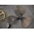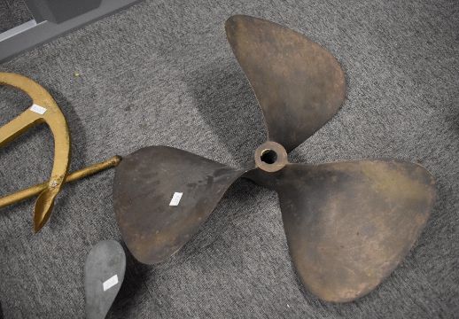 Bronze 3-blade boat propellers, one measuring approx 63cm and the other approx 39cm. Sold together with a metal marine/ship porthole, with hinged cover covering glass, approx 39cm diameter and a gold-coloured metal ship's anchor with attached hinged support arm, possibly a decorative piece, 47cm x 87cm overall.(4)
