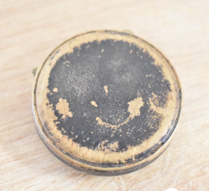 Brass pocket compass, thought to be WW1 or earlier vintage, 45mm diameter, having a bronzed finish brass case, bevelled glass and a blued needle with gold painted 'N' and 'S' points on a brass pivot. There are no maker's marks and the paper compass card is unsigned, however, it is in the style of Francis Barker & Co and there is a distinctive Fleur-de-Lys design at the top replacing the 'N' known to be used by Short & Mason. Appears to be in working order and housed in a leather case missing its lid.(1)