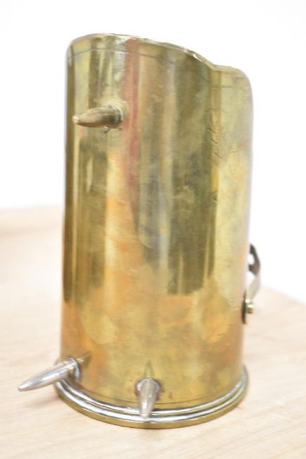 WW1 Trench Art brass shell cases, adapted mixed-size selection, two 18-pounder 1915 in form of coal scuttle, all with handles, one with foliate etching and bullet decoration, a third smaller decoratively etched with foliate, flags and Souvenir of the Great War 1914-1917, three smaller, one stamped Polte Magdeburg Sept 1915, the other two dated 1899, smallest 9cm diameter 9cm height, largest 10cm diameter x 20cm height.(6)