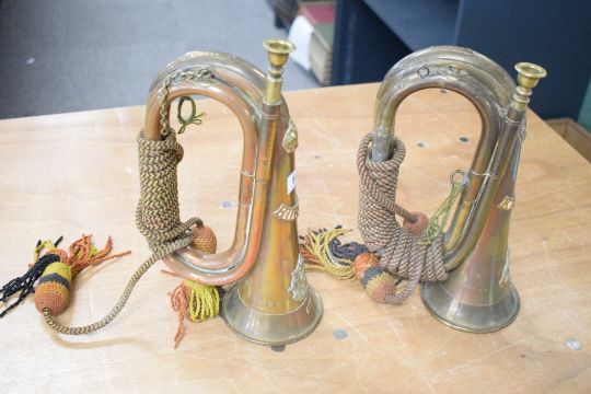 WW1 period military brass and copper bugles with badges for the Border Regiment and the King's (Liverpool) Regiment, both original condition with mouthpieces present, military crowsfoot, coloured tassels, no dates seen but King's Crown on both, 28cm overall. First with Border badge and title, DUKE, TBR, DUKE R 95844 markings and second with King's badge and title, REID, KINGS, 97379 W.R. Both in reasonable condition for age.(2)