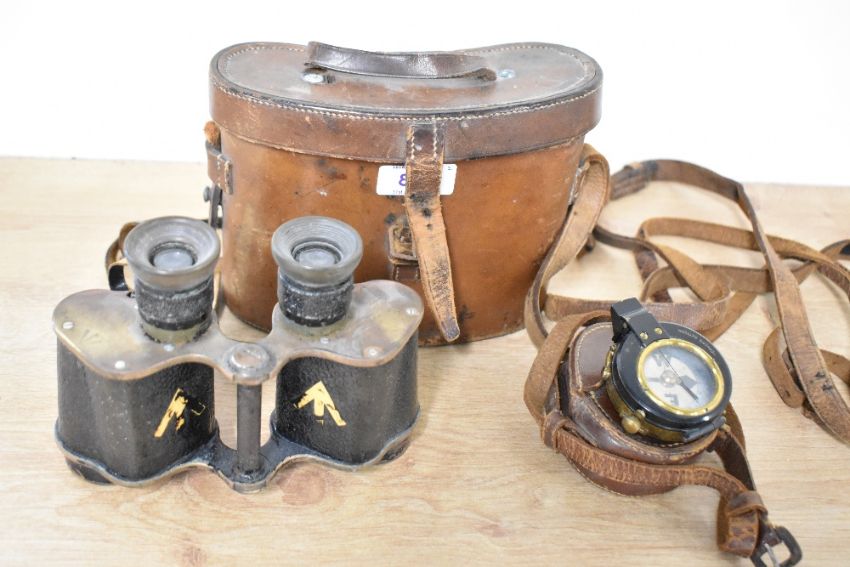 WW1 period E.R. Watts & Son of London Verner's Pattern VI Military Prismatic Compass dated 1913 numbered 5641, brass measuring band, brass ring and screws, in original leather pouch with folding lid and marked in black pen LT. M. POWELL R.F.A. with adjustable leather strap, all in good condition for age. Sold together with a pair of military binoculars in leather case with broken leather strap, both stamped with military crowsfoot and various makers marks, in poor condition and believed to have belonged to same owner, Lt. Powell.(2)