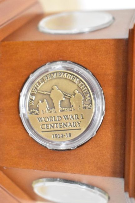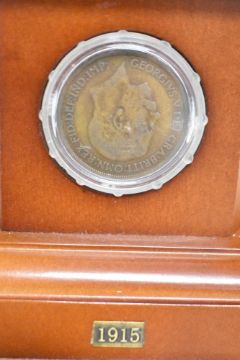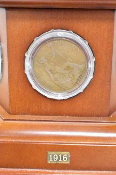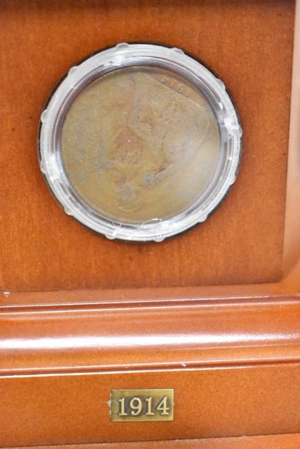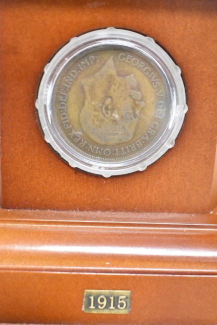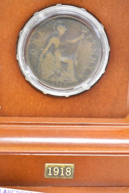 Danbury Mint bronzed sculpture The Brave British Tommy, depicting a British 'tommy' in full battle kit and sat on an ammunition case drinking a welcome cup of tea. Set on a wooden plinth with a specially-commissioned commemorative coin and five genuine dated penny pieces representing each year of the Great War, from 1914 to 1918, in circulated condition, all in plastic holders and fitted into the wooden plinth, 16cm x 18cm x 29cm high, the soldier being 16cm high. In original box and packaging, with Certificate of Authenticity.(1)