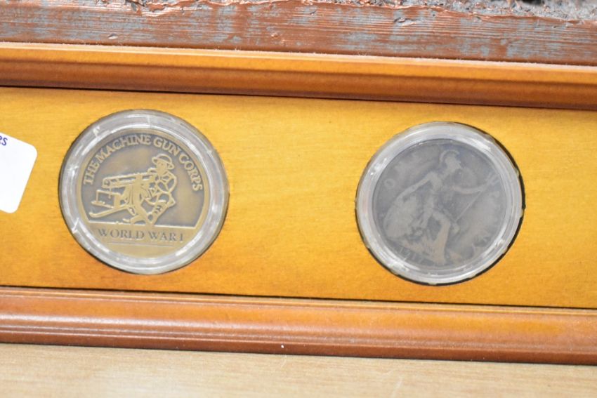 Danbury Mint bronzed sculpture of Defending The Line - The Machine Gun Corps, a commemoration of the role played by the MGC during WW1, set on a wooden plinth with a specially-commissioned commemorative coin and a genuine 1917 penny in circulated condition, both in plastic holders and fitted into the wooden plinth, unboxed, 13cm x 23cm x 16cm high. Sold with Certificate of Authenticity.(1)