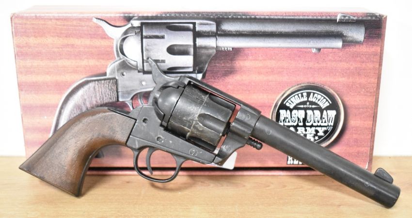 USA Single Action Fast Draw Army .45 Army COLT-type pistol, in its box marked KOLSER S.A. Replica Made in Spain, 12cm barrel, 28cm overall.(1) Trigger/hammer in working condition, some wear seen, ideal re-enactment or display piece.