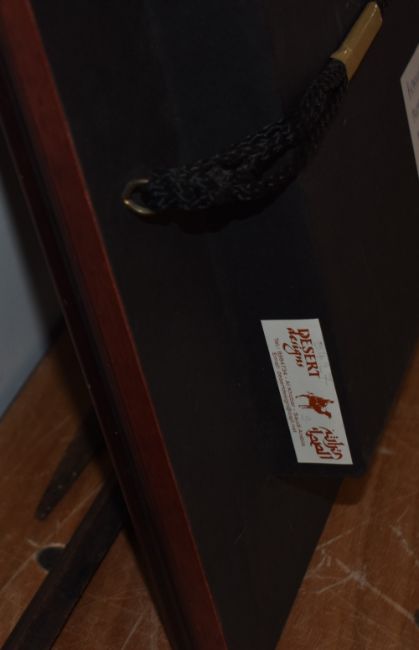 Bedouin Qudaimiyah dagger, horn-hilt with silver and leather sheath, from South-Western Saudi Arabia, first half 20th century. The dagger with the typical upward-turned steel blade, and I-shaped horn hilt embellished with silver studs and copper roundels, the brown leather sheath ornate with silver wires rope-twisted, and silver sheets chased in relief with beaded bands and engraved fretwork around the tip, mounted on a fragment of Persian kelim rug or blanket, glazed and framed for display, with an old inventory label from Desert Designs based in Al-Khobar, a City and Governorate in the Eastern Province of the Kingdom of Saudi Arabia, the dagger approximately 22cm long, the frame 36.5cm x 45.5cm.(1)