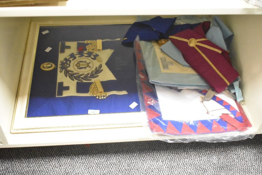 A framed Grande Lodge Undress Apron, w55cm, sold together with various other Masonic items