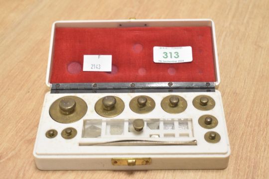 A box containing various brass weights