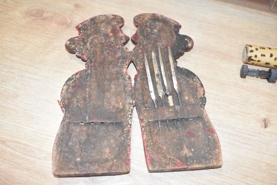 A relief diorama depicting an ornate boat with figures, L42cm, sold together with 2 cases holding blades, (3)