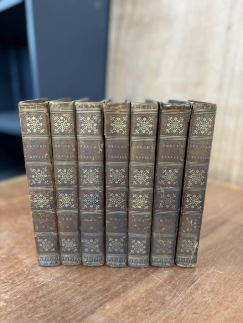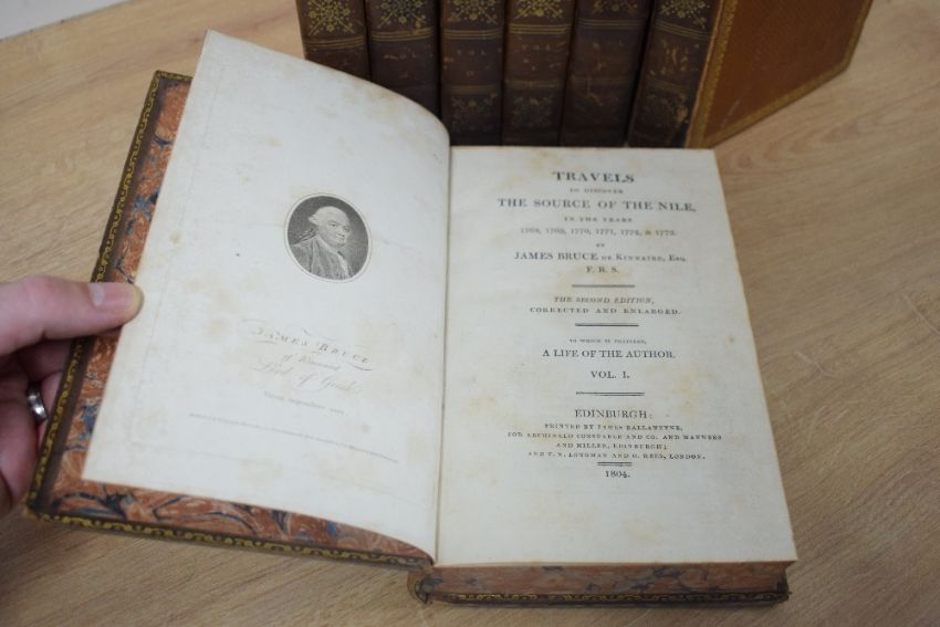 Antiquarian. Travel. Bruce, James - Travels to Discover the Source of the Nile, in the Years 1768, 1769, 1770, 1771, 1772, & 1773. Edinburgh: 1804. Second edition, corrected and enlarged. In seven volumes. Contemporary diced calf, gilt. Some wear to spines. (7)