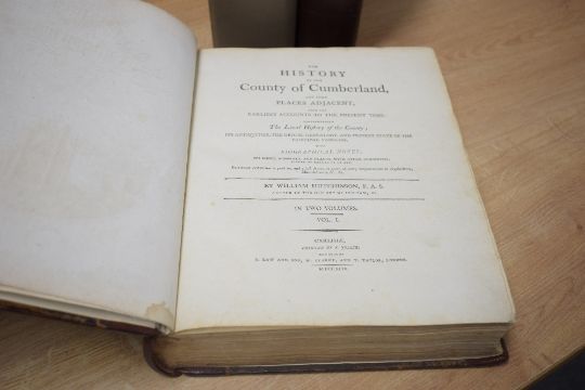 Antiquarian. Local History. Hutchinson, William - The History of the County of Cumberland, &c. Carlisle: 1794. In two volumes. With plates, and the folding plans for Whitehaven, Workington and Carlisle. No county map. Re-backed. With; Whellen, William - History and Topography of the Counties of Cumberland and Westmorland. Pontefract: 1860. Re-backed. (3)