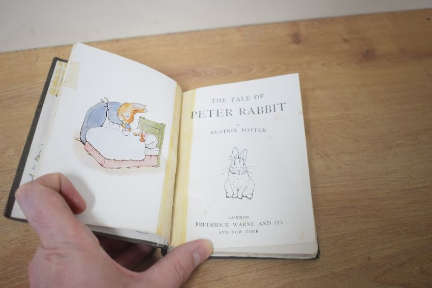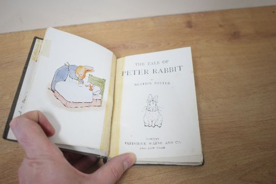 Children's. Potter, Beatrix - The Tale of Peter Rabbit. London: Frederick Warne and Co. First edition, 9th printing. Circa 1910. With 'shed big tears' on page 45. See images for end papers. Re-backed in cloth. (1)