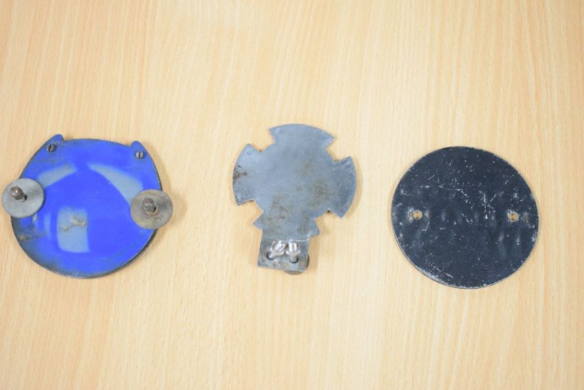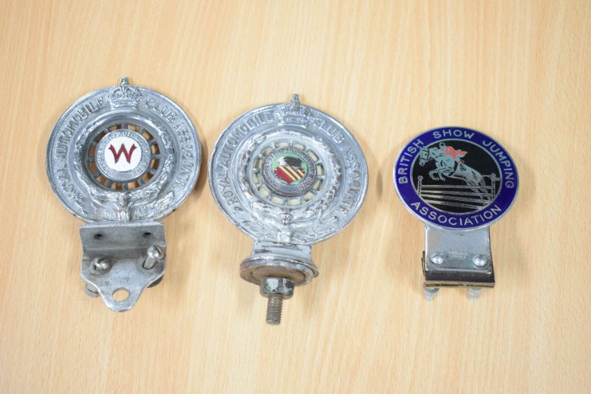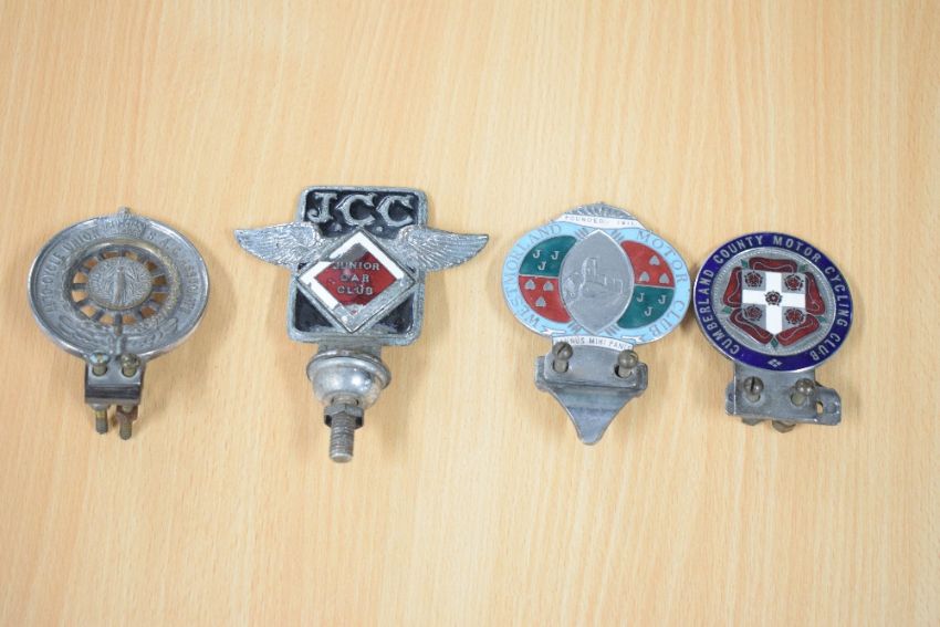 An Assortment of 10 vintage bumper and car badges including Westmorland automobile club, Cumberland motor cycling club, Manchester Automobile club Associate, Westmorland Motor club, Junior car club, RAC Auto cycle club, British field sports, British show jumping Association, B.H.S and Association of Public Address Engineers.