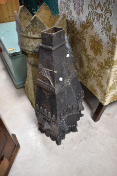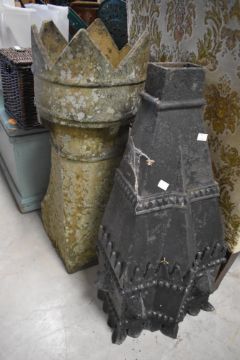 A large cast iron hopper or chimey top and a clay chimney pot (crownstyle af), each height approx. 75cm