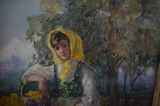M.E.Emson (19th/20th century) watercolour, charming study of a female fruit picker, signed and dated 1920 lower right, within a moulded gilt frame, under glass 43cm x 28.5cm & 62.5cm x 48cm overall.