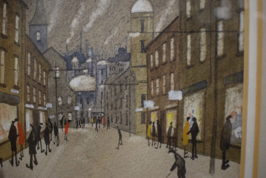 Geoffrey Woolsey Birks (British 1929-1993) a pair of watercolours 'Man with Dog' and 'Monday Morning Again', the first a northern town with shoppers, the second workers arriving at a mill, both signed lower right the latter also dated (1980), titled and numbered '98' and '102' verso, within stepped card mounts and moulded frames, under glass 16cm x 11cm & 29cm x 24cm overall.