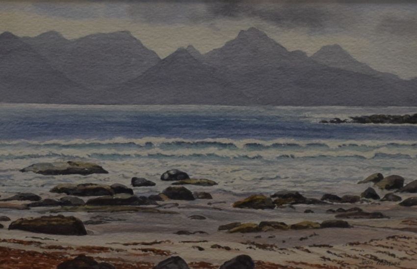 Jean Thomas (British contemporary) watercolour 'Isle of Rhum from Singing Sands Isle of Eigg' an attractive Scottish scene of the Inner Hebridean island as seen from a beach, signed lower left, title and artist details verso, within washline mount and moulded frame, under glass 25.5cm x 17cm & 43.5cm x 36.5cm overall.