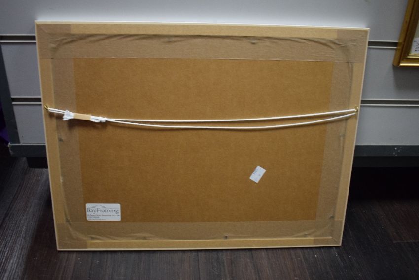 Diana T (contemporary) three acrylics on canvas 'After Seago', 'Turmoil' and 'Rainbow Bridge' within white card mounts and white painted frames, under glass 26.5cm x 36cm & 38cm x 48cm overall.