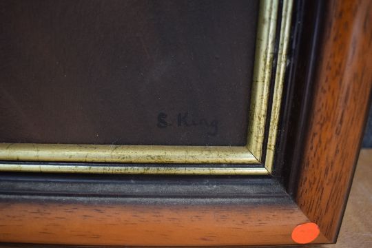 Sheila King (British contemporary) Oil on canvas, 'Des' traditional portrait of a brown spaniel on olive background, signed lower right, titled verso, within a moulded frame, 50cm x 39cm & 61cm x 50cm overall, some marks to canvas.