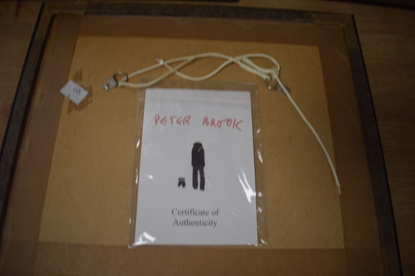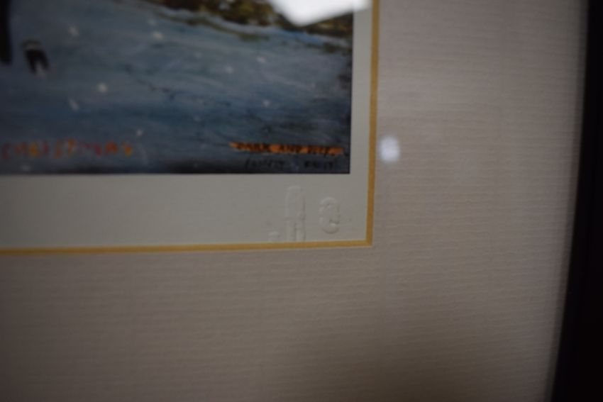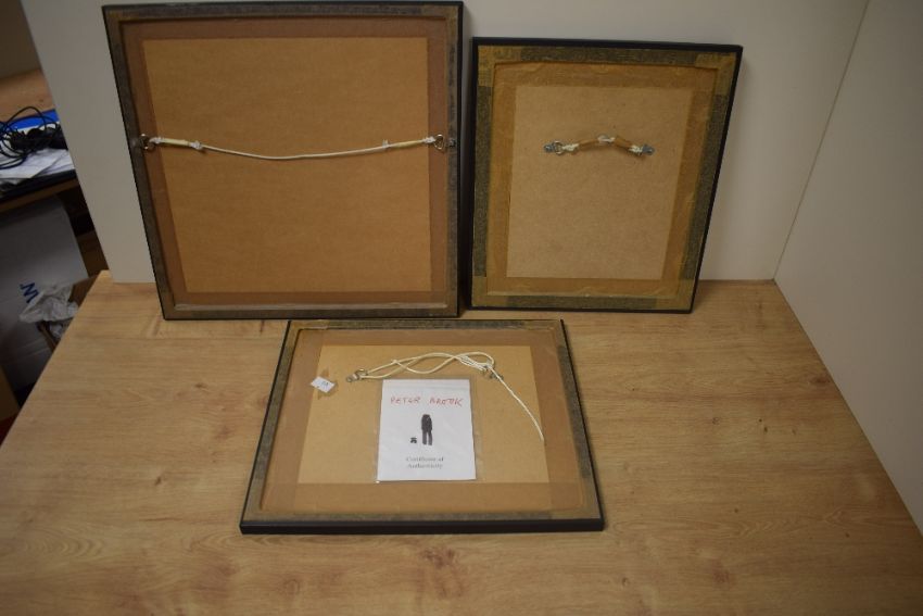 After Peter Brook (British 1927 - 2009) three framed prints 'The Woods are Lovely at Christmas' limited edition print, gentleman walking his dog through a snowy woodland, numbered 165/195 printed title and signature lower right along with blind stamp to margin, certificate of authenticity verso , in a card mount and stained black frame, under glass 22cm x 17cm & 37cm x 32cm overall, sold along with 'Slippery Steps', gentleman and dog walking up snow covered hill, printed title and signature lower right, within a card mount and black stained frame, under glass, 19cm x 14cm & 36.5cm x 31.5cm overall and 'Neighbours' featuring two border collies peering out under red barn doors, printed title and signature lower right, within a card mount and black stained frame, under glass 26cm x 26cm and 40cm x 40cm overall
