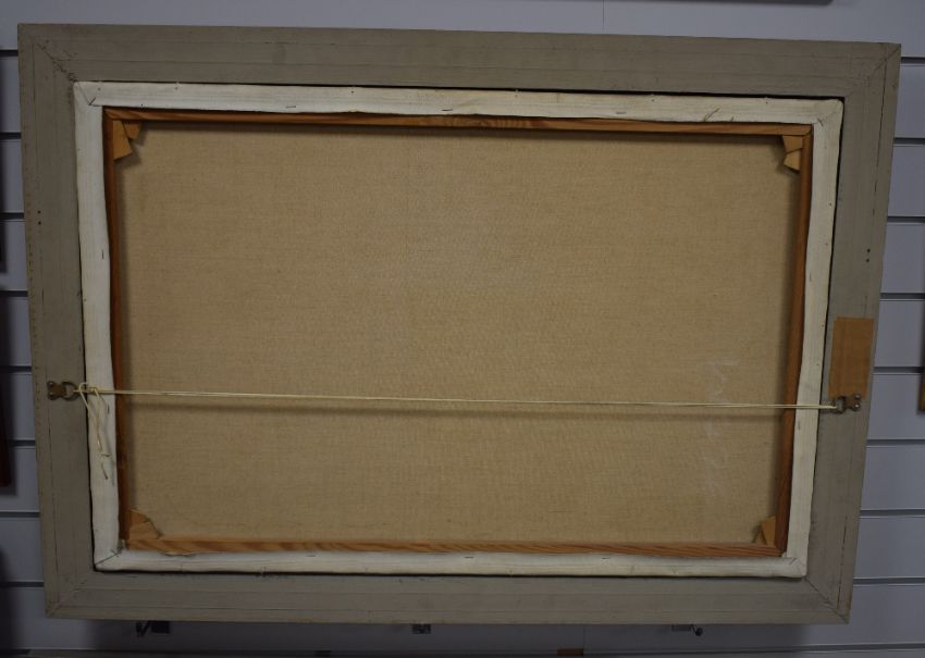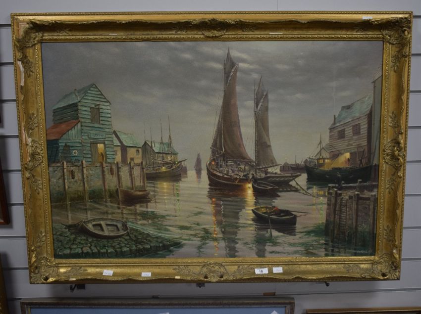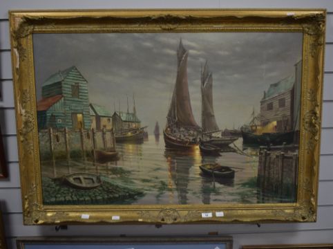 Ruffell (British 20th century) oil on canvas, fishing harbour scene with boats, buildings and figures, signed and dated 73 lower right, within a moulded gilt frame 59cm x 90cm & 74cm x 104cm overall.