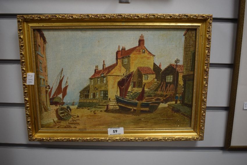 A. Heathecoat (British 20th Century) Oil on board 'Robin Hood's Bay' depicting fishing boats by the beach, attributed to artist and title verso, within moulded gilt frame, 34cm x 22cm & 39cm x 27.5cm overall some ageing and discolouration.