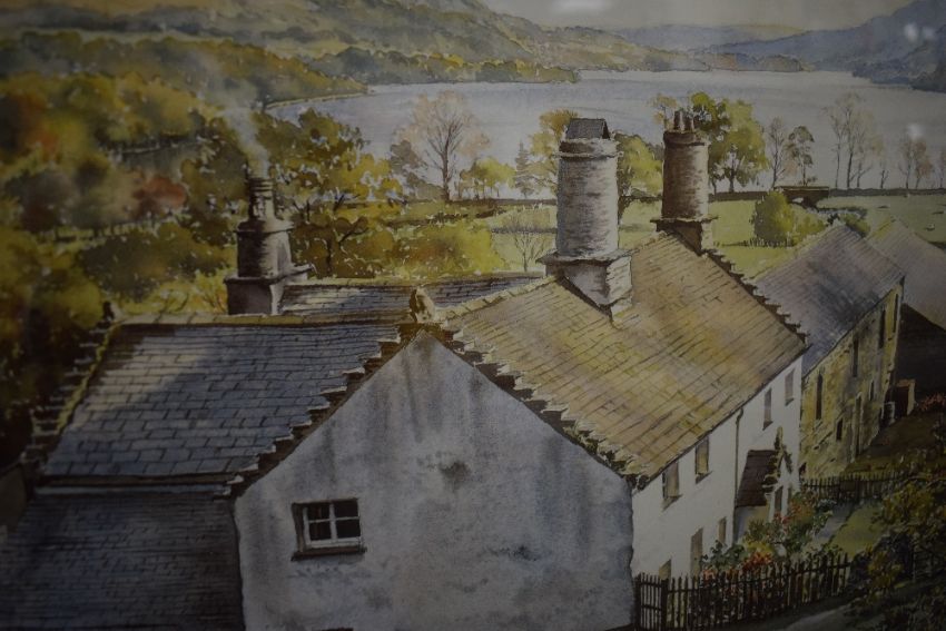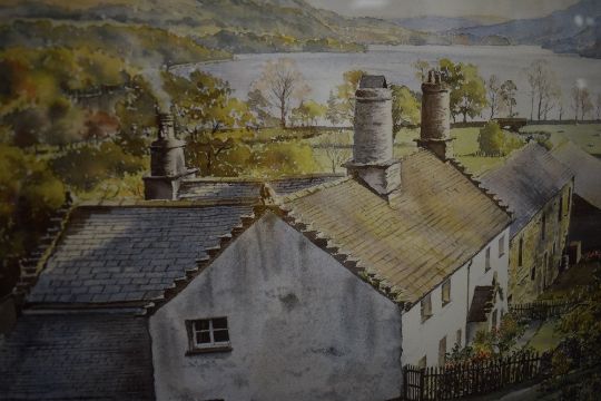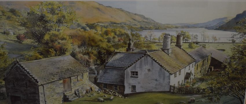 *Local Interest* Graham Carver (British Contemporary) print, quintessential Lake District scene depicting sheep grazing near farmers cottages, signature lower right, in stepped washline mount and moulded gilt and wood frame, under glass 61.5cm x 29.5cm & 82.5cm x 49.5cm overall, print has slipped in mount obscuring potential limited edition number, signature and title.