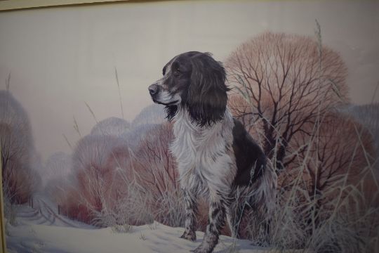 After Nigel Hemming (British b.1957) A spaniel atop a mound of snow on a country lane, signature lower right and further printed sketch of spaniel to margin lower left, within a washline mount and gilt frame, under glass 38.5cm x33cm & 57.5cm 51.5cm overall.