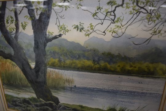 *Local interest* Jill M Aldersley (British 1943 - 2007) watercolour 'Still Evening, Elterwater', a view from the shore of the lake towards the Langdale Pikes, signed lower right, counter signed in pencil to mount lower left and titled to mount lower right, within stepped washline mount and moulded frame, under glass 32cm x 23.5cm & 48cm x 40cm overall.