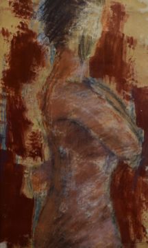 Artist unknown, pastels on paper, sketch of nude figure, unsigned, within white card mount and gilt painted frame, under perspex 53cm x 32cm & 84cm x 65cm overall. Frame requires some attention, backing board loose, lower right corner joint open.