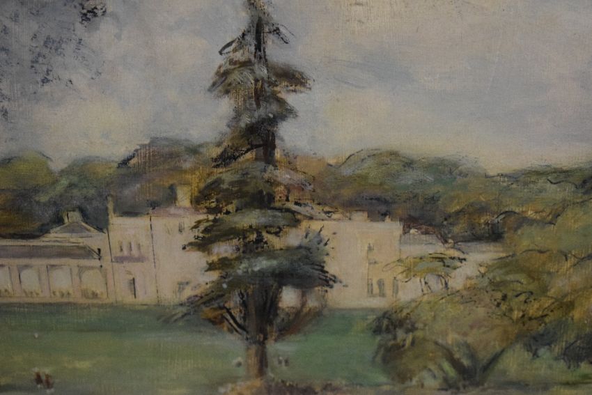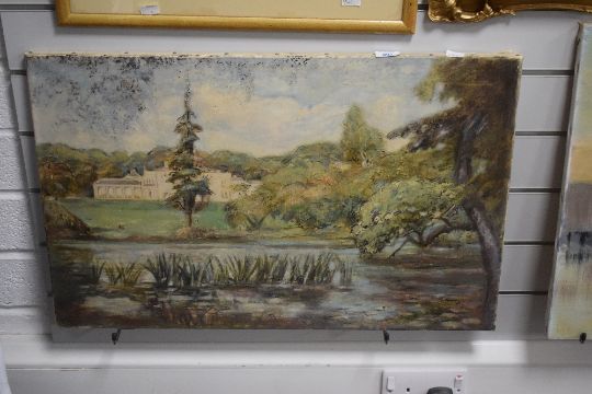 Pauline Slow (British 20th century) oil on canvas, country house and gardens, signed and dated 1955 lower left, unframed, 46cm x 71cm overall.