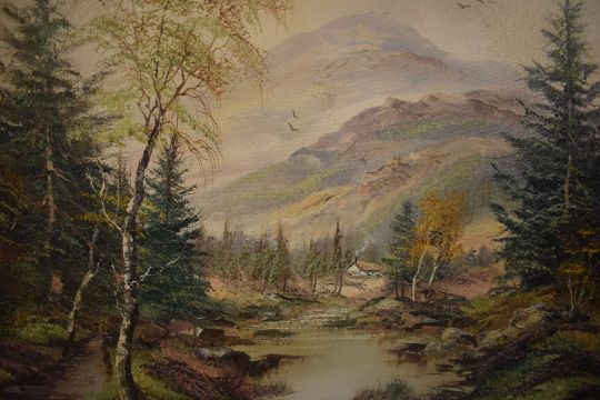 John Corcoran (British b.1940) a pair of oil on canvas's,depicting an autumnal woodland river, the second a rural cottage withn an autumnal woodland setting, both signed lower left, each within moulded gilt frames, 59.5cm x 49.5cm & 79cm x 69cm overall and 60cm x 49.5cm & 79cm x 69 cm overall, the first has a tear in the canvas and the second has damage to frame moulding.