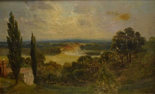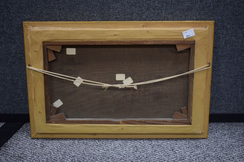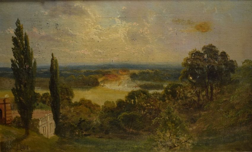 J Lewis (British 19th/20th century) an early 20th century oil on canvas, river scene with bridge and boats, signed lower right and dated 1909, within a moulded gilt frame, 24cm x 40cm & 29cm x 44cm overall sold along with a landscape by the same artist and of the same dimensions, with patched repairs showing to the reverse and with evident over-painting.