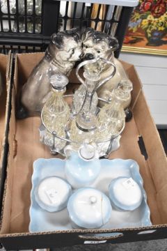 A light blue and white porcelain condiment set sold together a pair of dogs in the style of Staffordshire pottery etc.