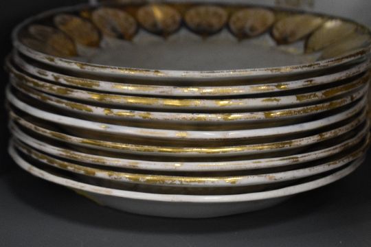 There are hairline cracks to three of the pieces: 1 long oval dish, 1 shell dish, 1 plate. The edge pattern on most items is in good condition however the central gilt design is very worn on most plates and some dishes. The long oval bowls are printed Wedgwood in red.