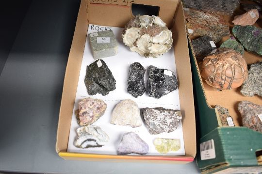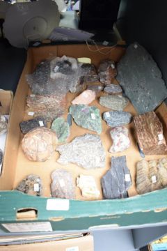 An assortment of mineral and rock samples, collected nationally and internationally, including petrified wood, jaspalite, opaline quartz, garnet mica.
